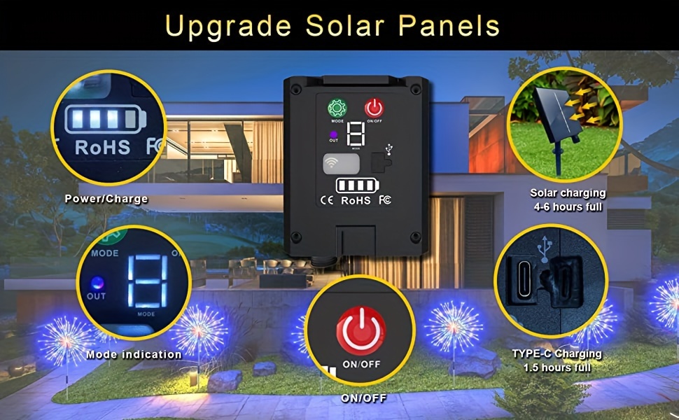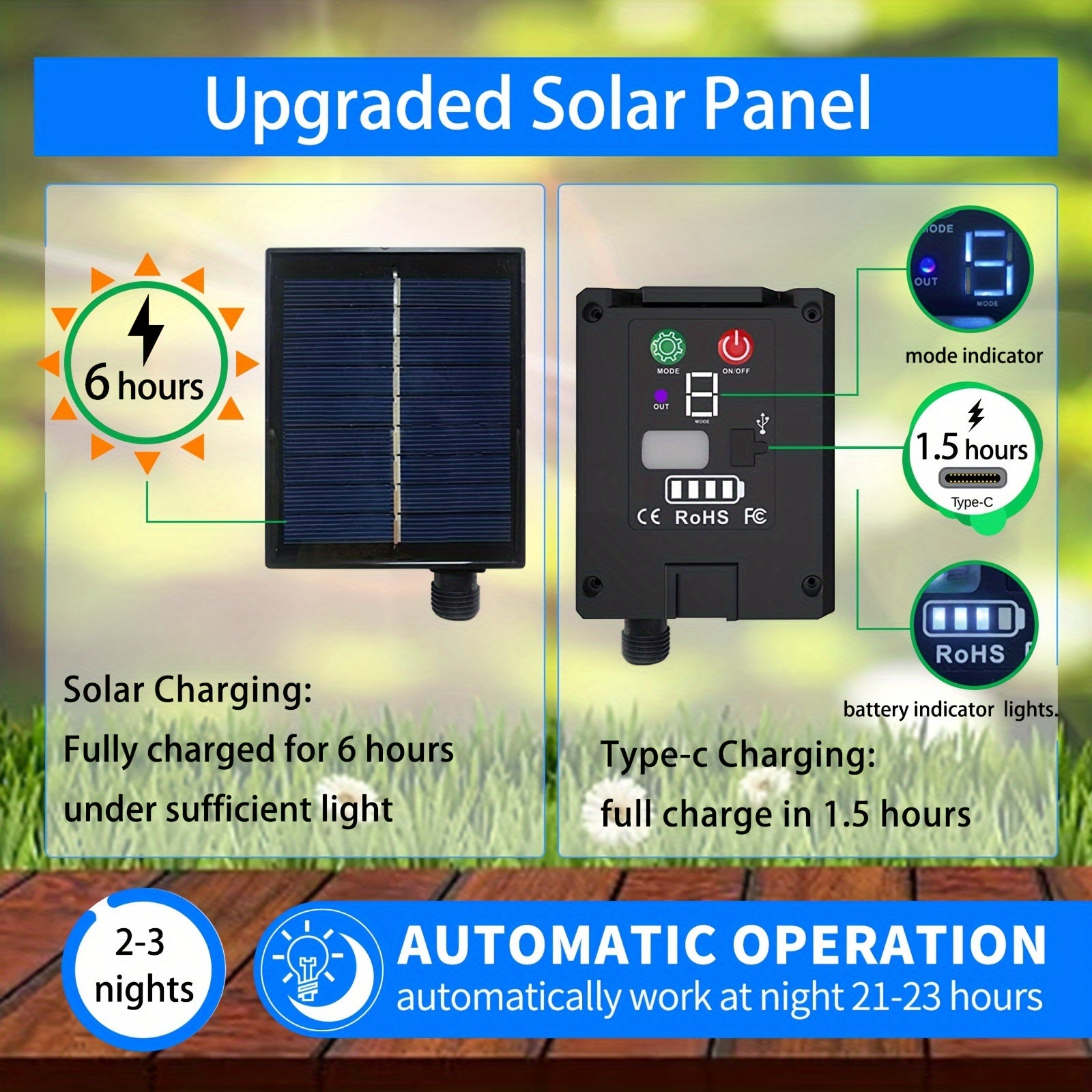There are two ways to charge: Upgraded solar panels for 4-6 hours to fully charge; Type-C charging for 1.5 hours to fully charge. Type-C charging solves the issue of not being able to charge on rainy and snowy days.
