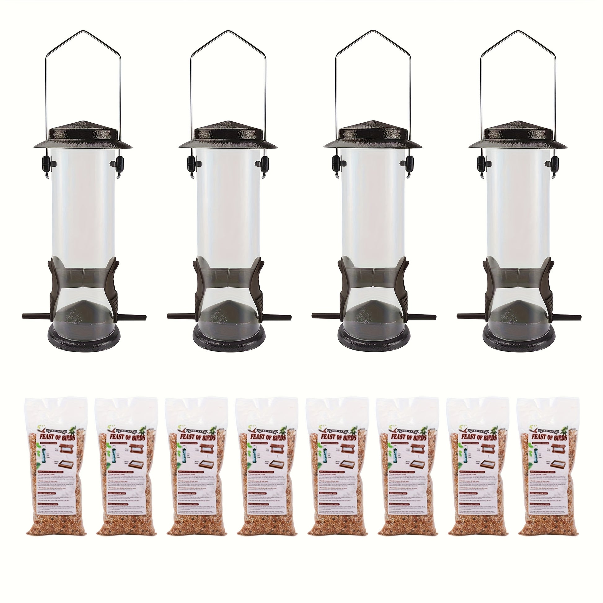 8-Bag Bird Food & 4 Feeder Set: 4 Outdoor Hanging Tube Bird Feeders + 8 Bags Of High-Nutrition Mixed Bird Food, Ready to Use Right Out Of The Box, No Need to Buy Extra Bird Food, Perfect Holiday Gift, Birds' Favorite!