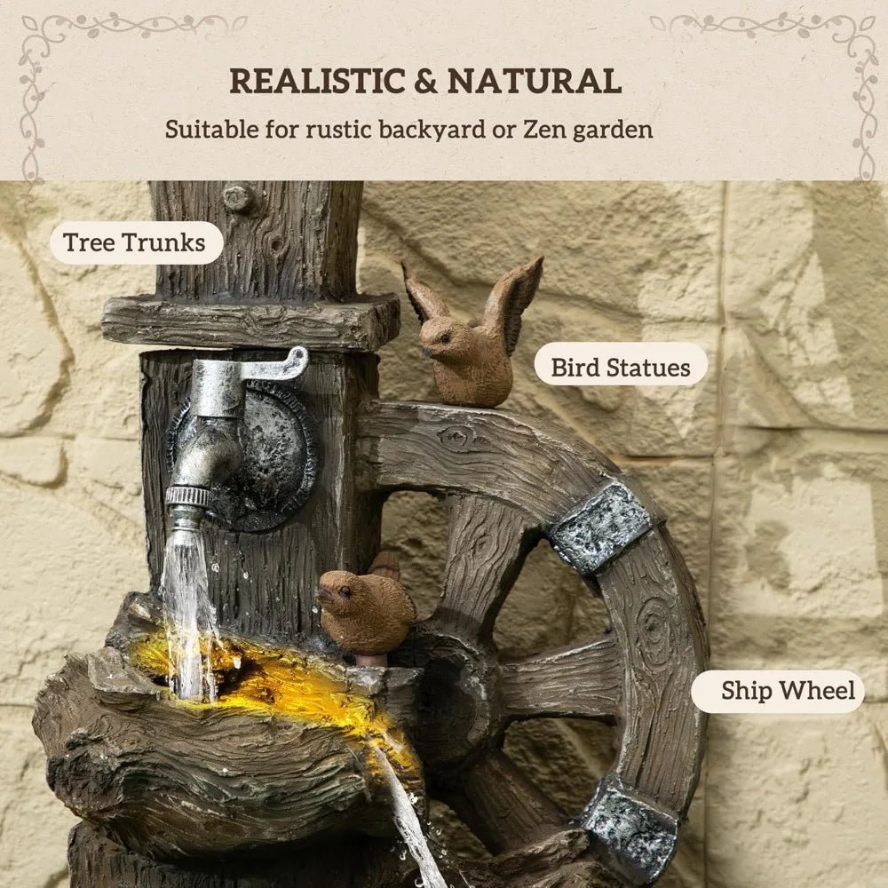 - Rustic Look: Realistic tree trunks and ship wheel design with two cute bird statues adding life to the garden water fountain, even when real birds aren't around