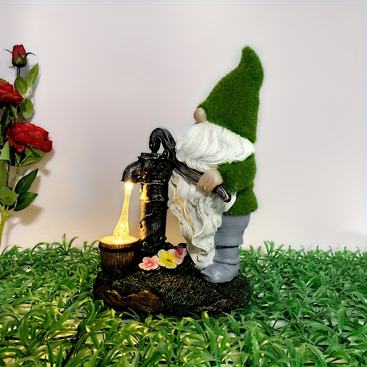 Solar-Powered LED Gnome Fountain Statue with Water Flow & Solar - 12" Resin Birdbath Garden Decor, Outdoor Water Feature with On/Off Button, Solar-Powered for Patio, Yard, Pond, Christmas Decoration (Green Gnome & Flower