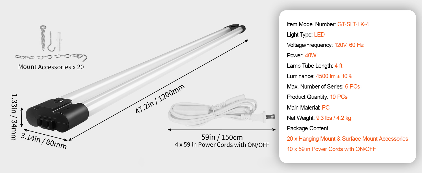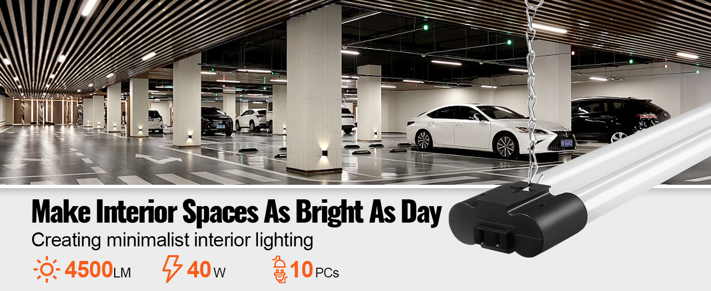 10PCs——SucceBuy 40W linkable LED shop light has the advantages of anti-interference, 4500LM high brightness, and hanging or surface mounting method. It can be connected in series with 6PCS, ideal for indoor lighting in warehouses, garages, small and medium-sized stores, offices, and home utility rooms.