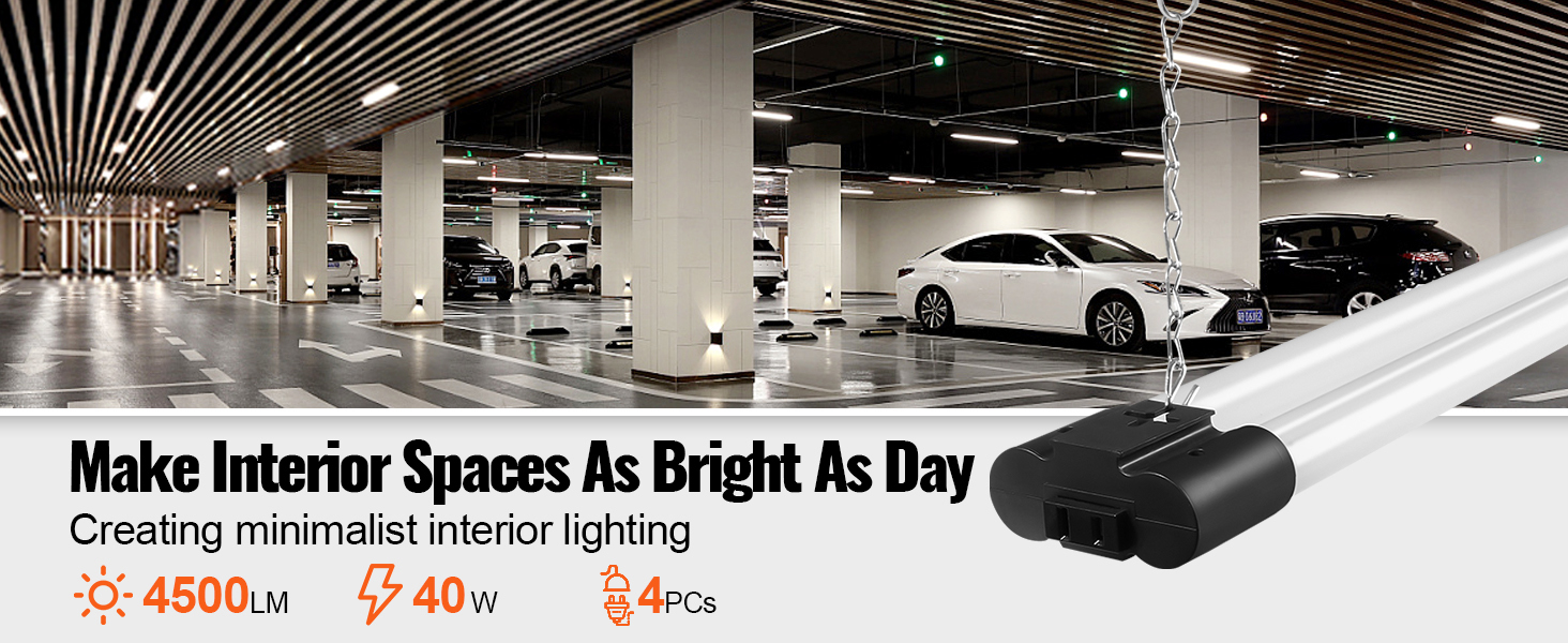 4PCs——SucceBuy 40W linkable LED shop light has the advantages of anti-interference, 4500LM high brightness, and hanging or surface mounting method. It can be connected in series with 6PCS, ideal for indoor lighting in warehouses, garages, small and medium-sized stores, offices, and home utility rooms.