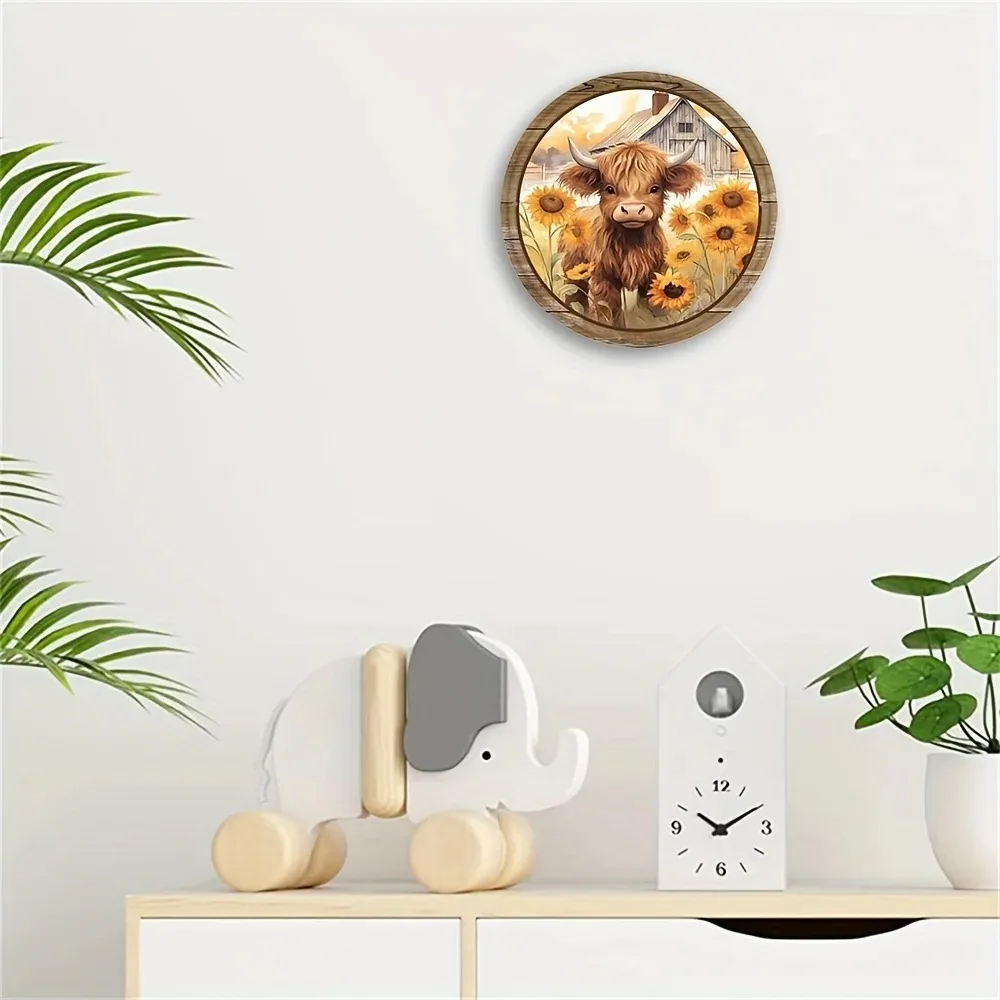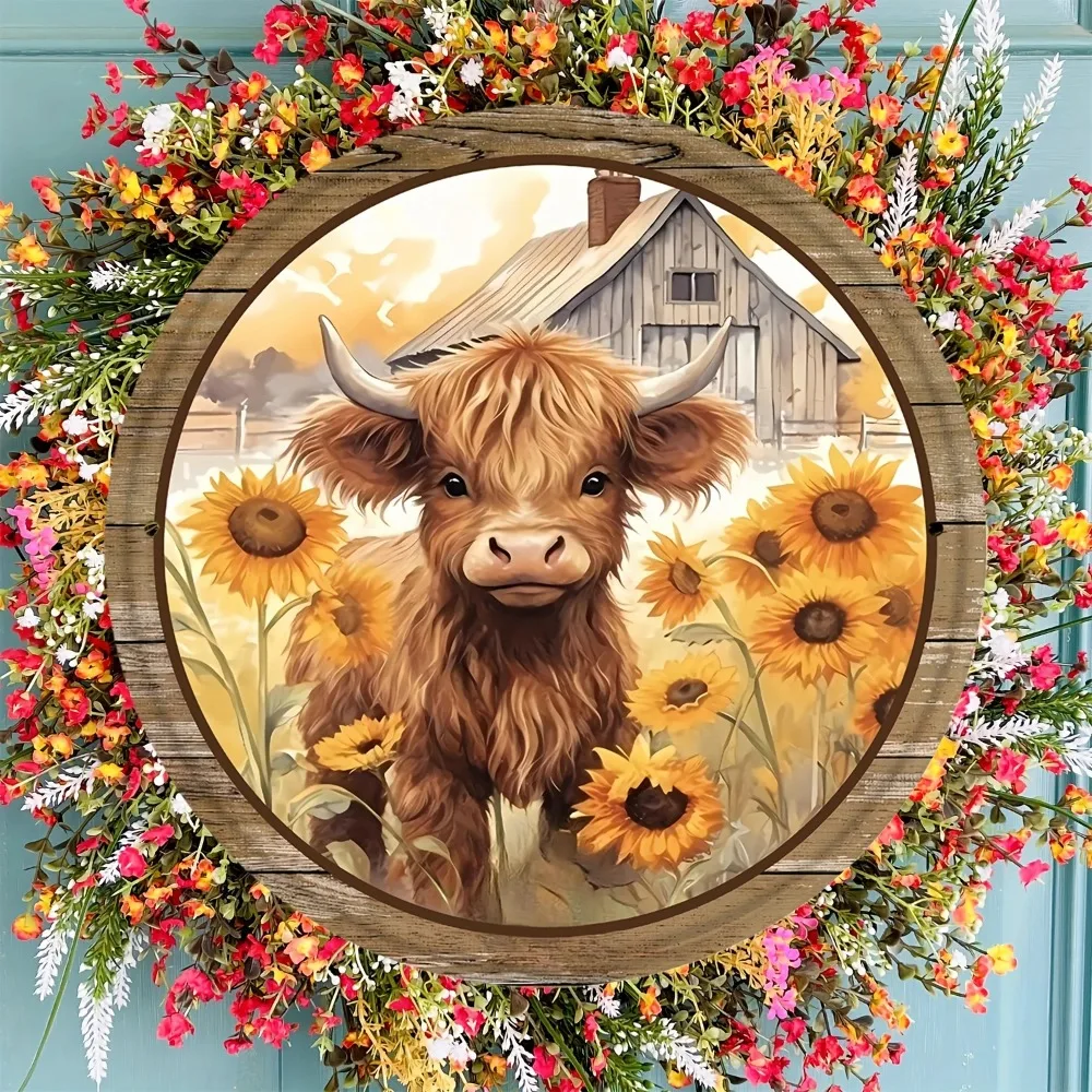 Tin Painting - Sunflower and Highland Cattle Round Metal Tin Sign | 8x8 inches 1pc Wreath Decor | Wall Decor & Wreath Enhancer