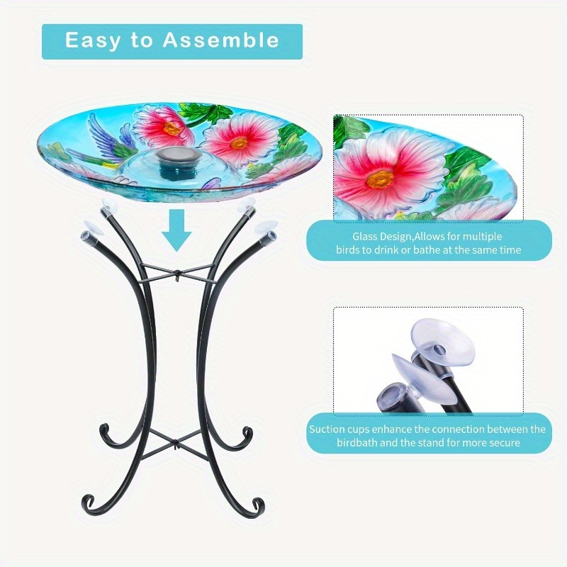 [Solar Powered Bird Bath]Solar bird bath with solar panel absorbs sunlight turned into electricity; the light automatically turns on at night, giving a unique look to the birdbath and creating a soft beautiful ambiece at night [Easy To Move & Store] The bird bath has solar LED lights and a foldable metal bracket, making it easy to move or store. Glass bowl design with colorful pattern is a gorgeous addition to any lawn, garden, yard, or outdoor space [Outdoor Bird Decor]Bird ba